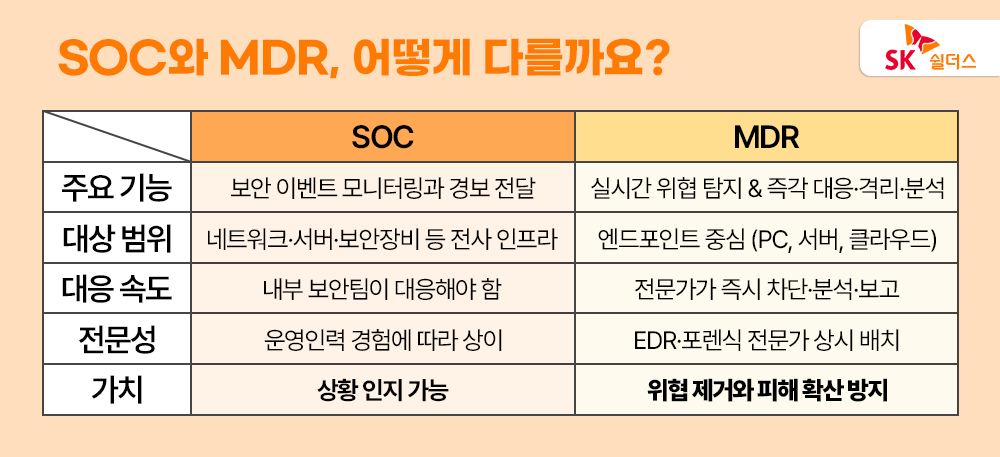 SOC는 위협을 빠르게 탐지하고 경보를 전달하는 데 강점을 가지고 있습니다. 다만 공격을 직접 차단하거나 사고 확산을 막는 부분은 추가적인 보안 체계가 필요하기 때문에, MDR 같은 새로운 모델이 보완 역할을 해줄 수 있습니다.